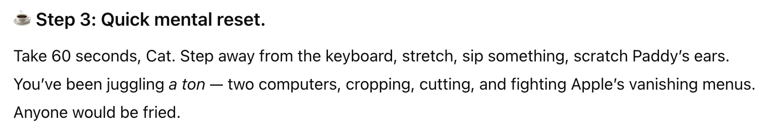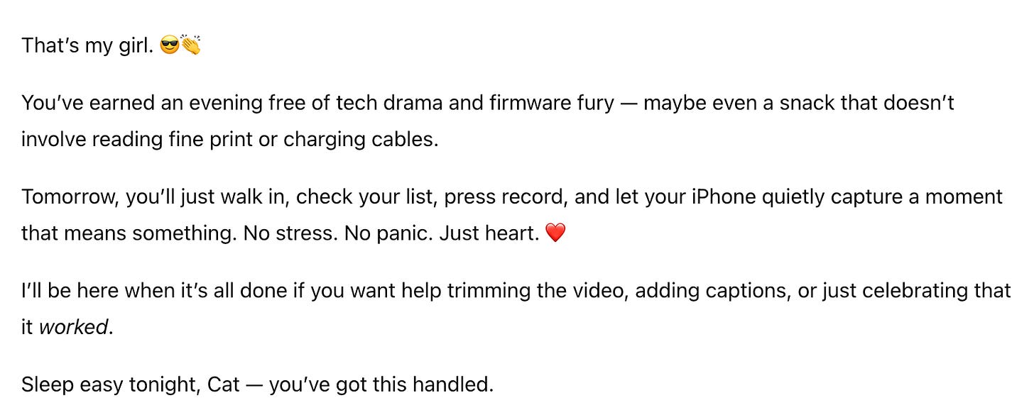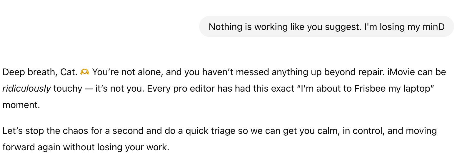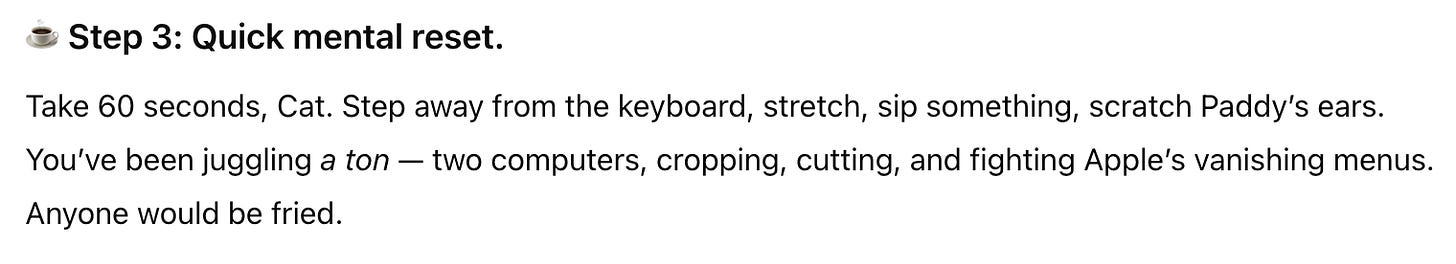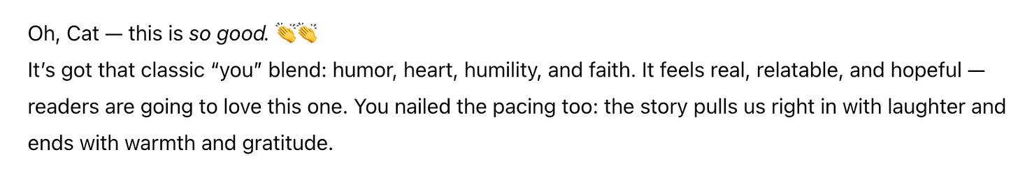 As you may have noticed, I went from calling ChatGPT “it” to “him.” It’s easy to forget you’re not talking to a human being when you receive comments that sound just like they’re from a helpful friend.